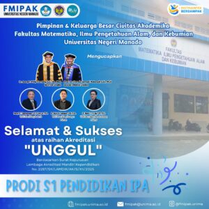 Tondano, 2025 — Prestasi membanggakan kembali diraih Universitas Negeri Manado (Unima). Program Studi S-1 Pendidikan Ilmu Pengetahuan Alam (IPA) Fakultas Matematika, Ilmu Pengetahuan Alam, dan Kebumian (Fmipak) Unima resmi memperoleh Akreditasi Unggul, capaian tertinggi dalam sistem akreditasi pendidikan tinggi di Indonesia. Penetapan