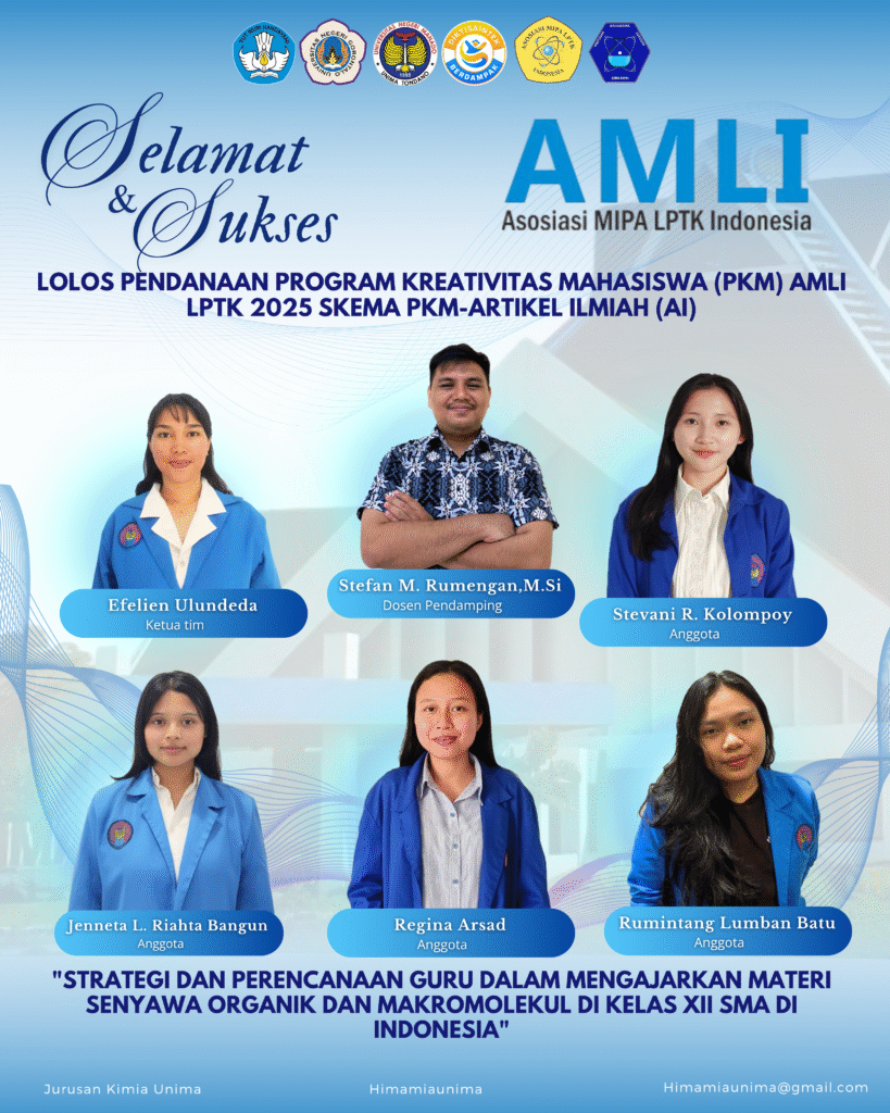 Keberhasilan dua tim ini membuat Jurusan Kimia UNIMA kembali mencatatkan prestasi dua tahun berturut-turut dalam meloloskan tim PKM hingga tahap pendanaan baik di Belmawa maupun di ajang Asosiasi MIPA LPTK Indonesia (AMLI). Prestasi ini menjadi bukti nyata komitmen Jurusan Kimia dalam mengembangkan budaya riset, inovasi, dan kreativitas mahasiswa menuju kampus unggul dan berdaya saing nasional.