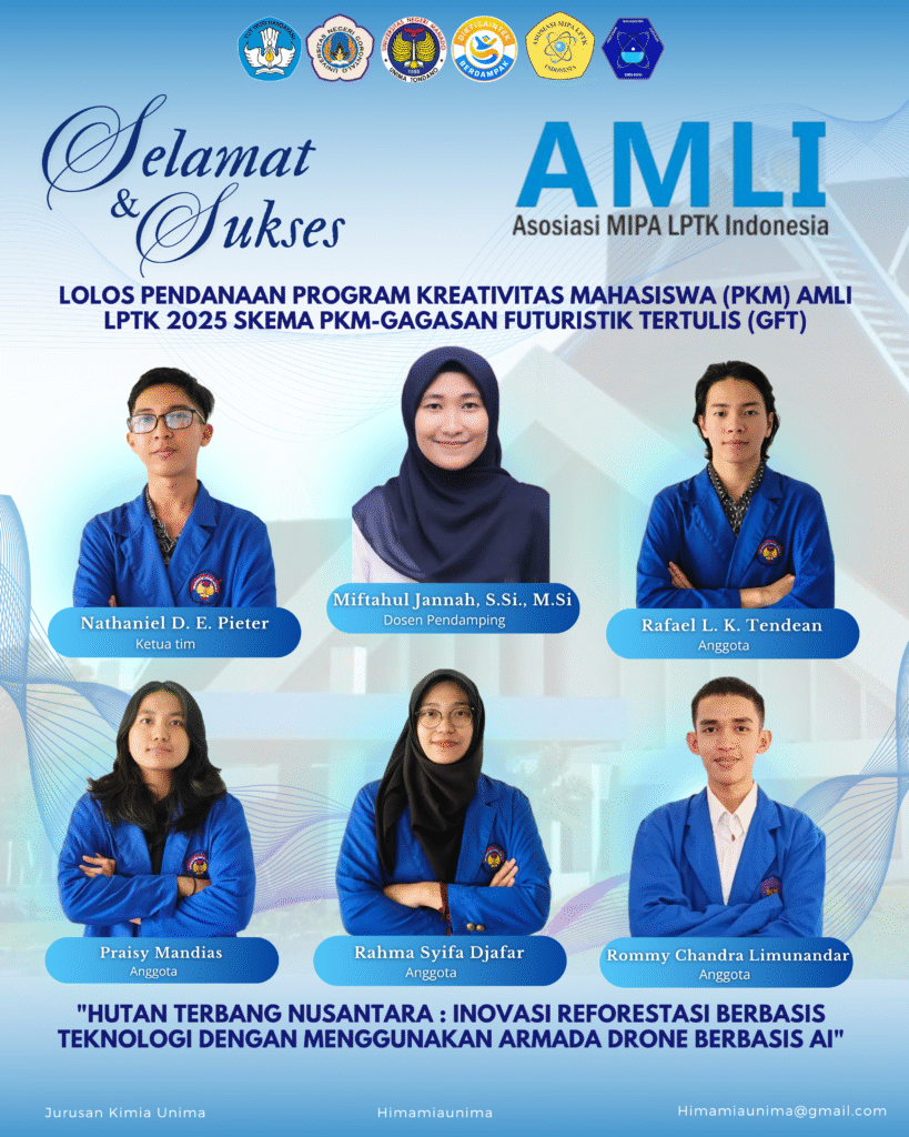 Mahasiswa Universitas Negeri Manado kembali menorehkan prestasi membanggakan di ajang Program Kreativitas Mahasiswa (PKM) tahun 2025. Dua tim dari Jurusan Kimia berhasil lolos pada tahap pendanaan dalam dua bidang berbeda, yaitu PKM Gagasan Futuristik Tertulis (GFT) dan PKM Artikel Ilmiah (AI). Capaian ini semakin memperkuat posisi Jurusan Kimia sebagai salah satu jurusan yang aktif dan produktif dalam kegiatan penelitian dan inovasi mahasiswa.